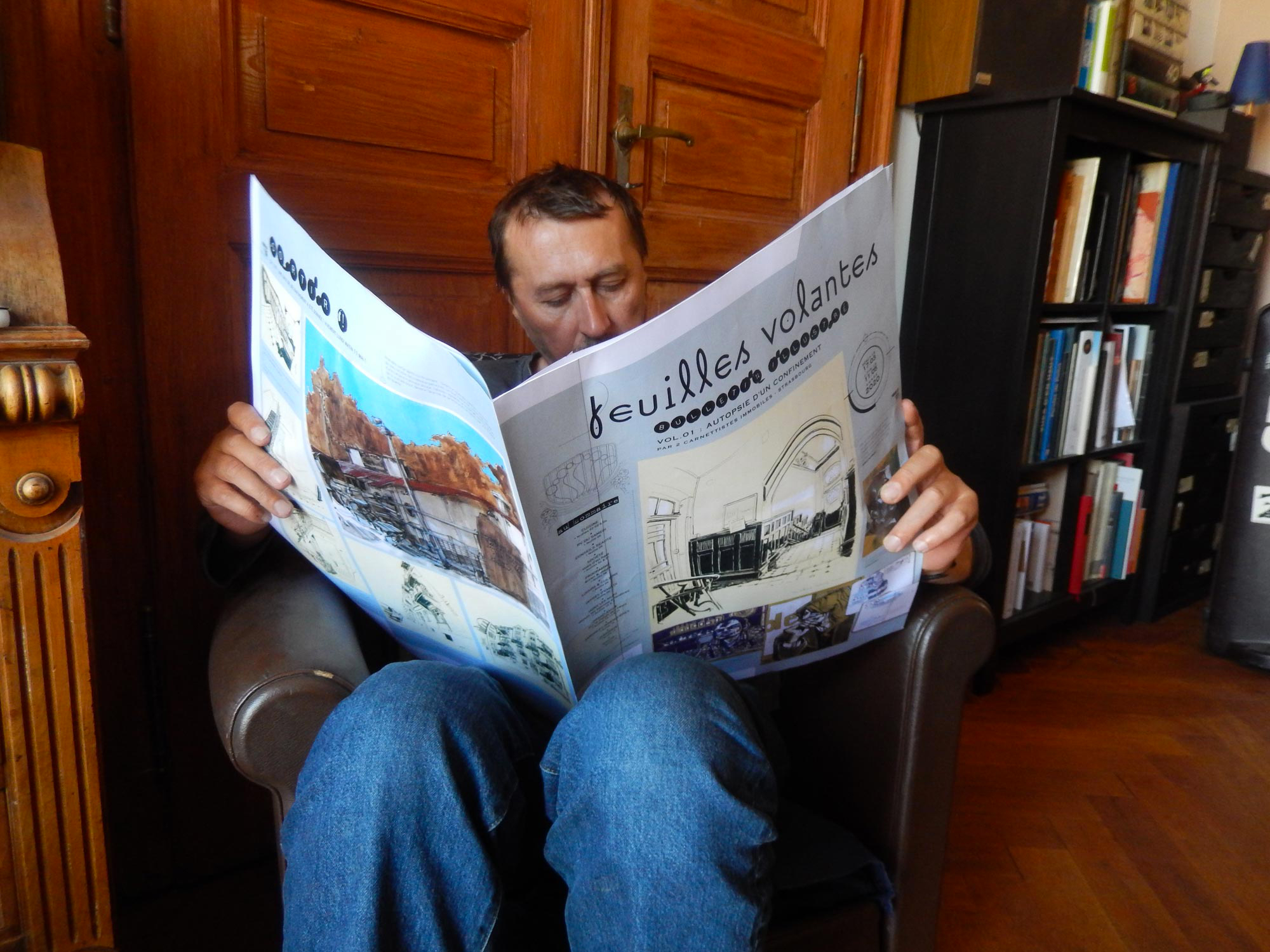 Lolo est en train de relire la maquette, au format réel, de nos futures feuilles volantes