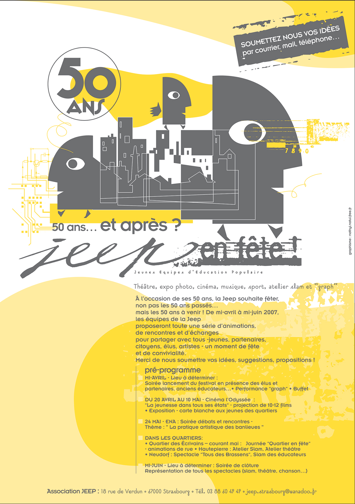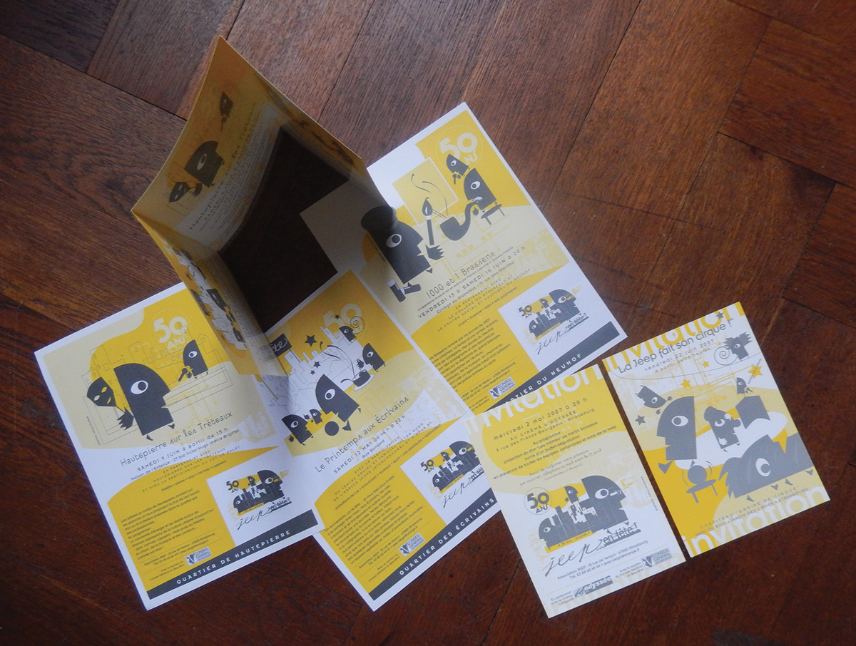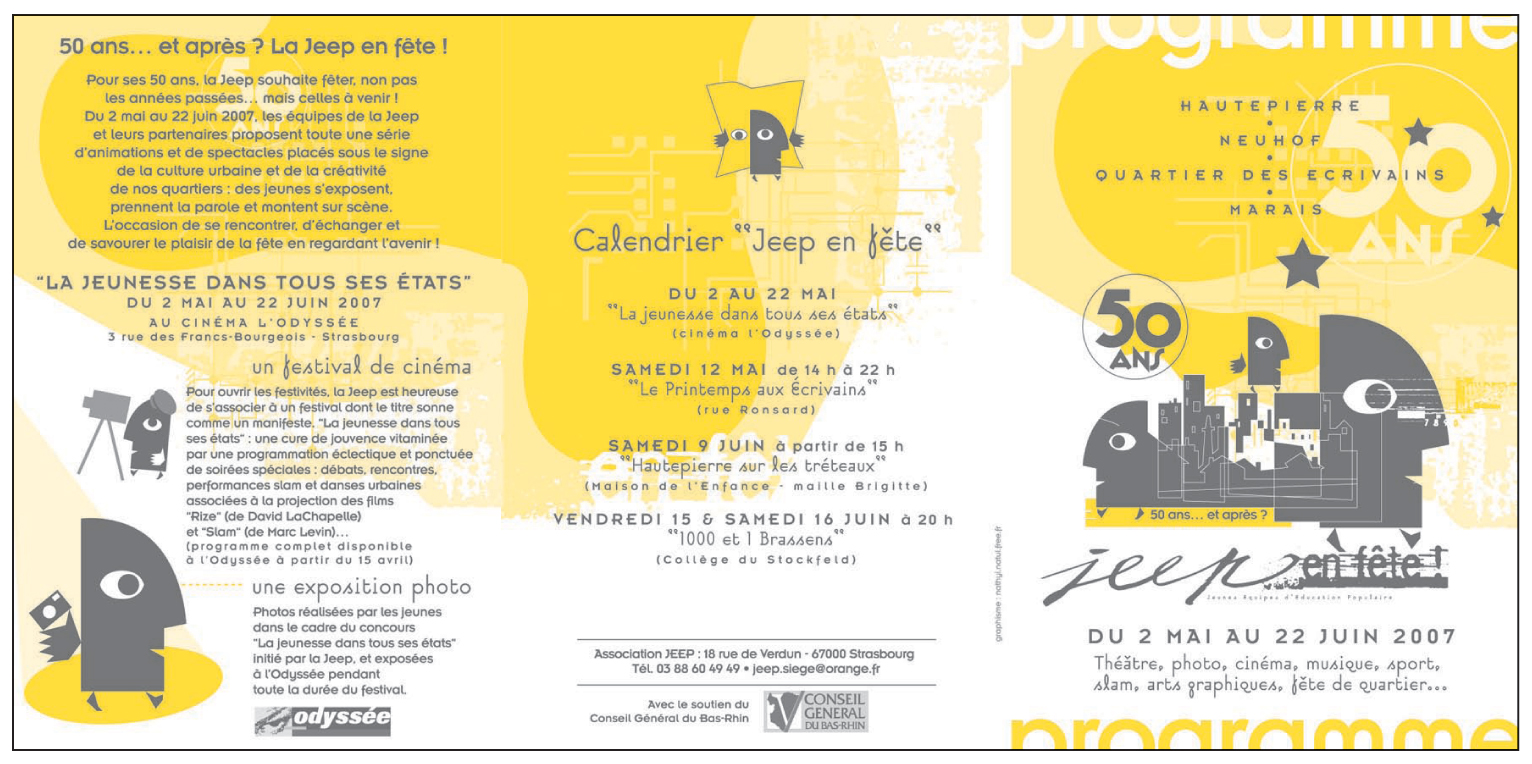Affiche A3 – paysage – des 50 ans de la JEEP • Affiche A3 – portrait -pré-programme • Le programme des festivités : 3 volets qui une fois replié à la taille d’une carte postale