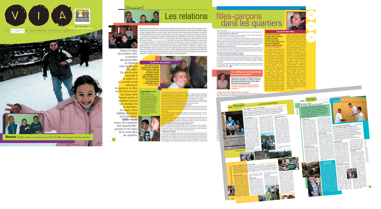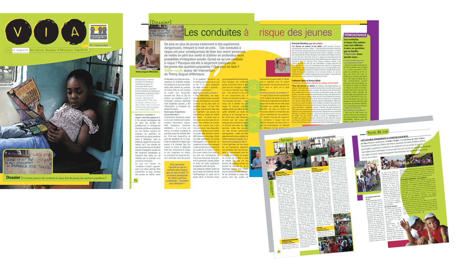 Un premier travail effectué pour la JEEP consistait en la création du magazine “VIA” – témoin de la vie dans et avec l’association – par la mise en place d’une charte graphique. Travail en collaboration avec Isabelle Freyburger (conceptrice-rédactrice). Le but était de faire connaître aux élus qui subventionnent cette association les réalisations des équipes d’éducation spécialisée. Possibilité pour les jeunes de proposer des sujets, de s’investir dans des projets… visibilité et reconnaissance.