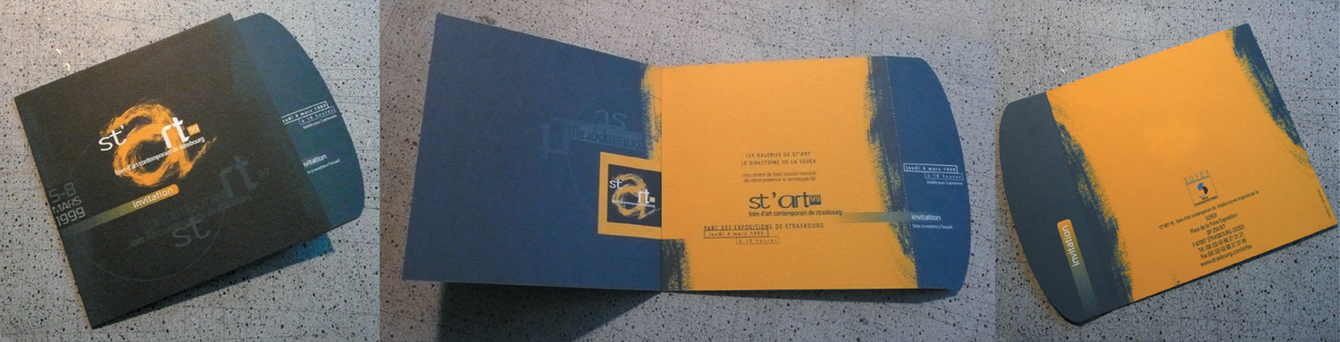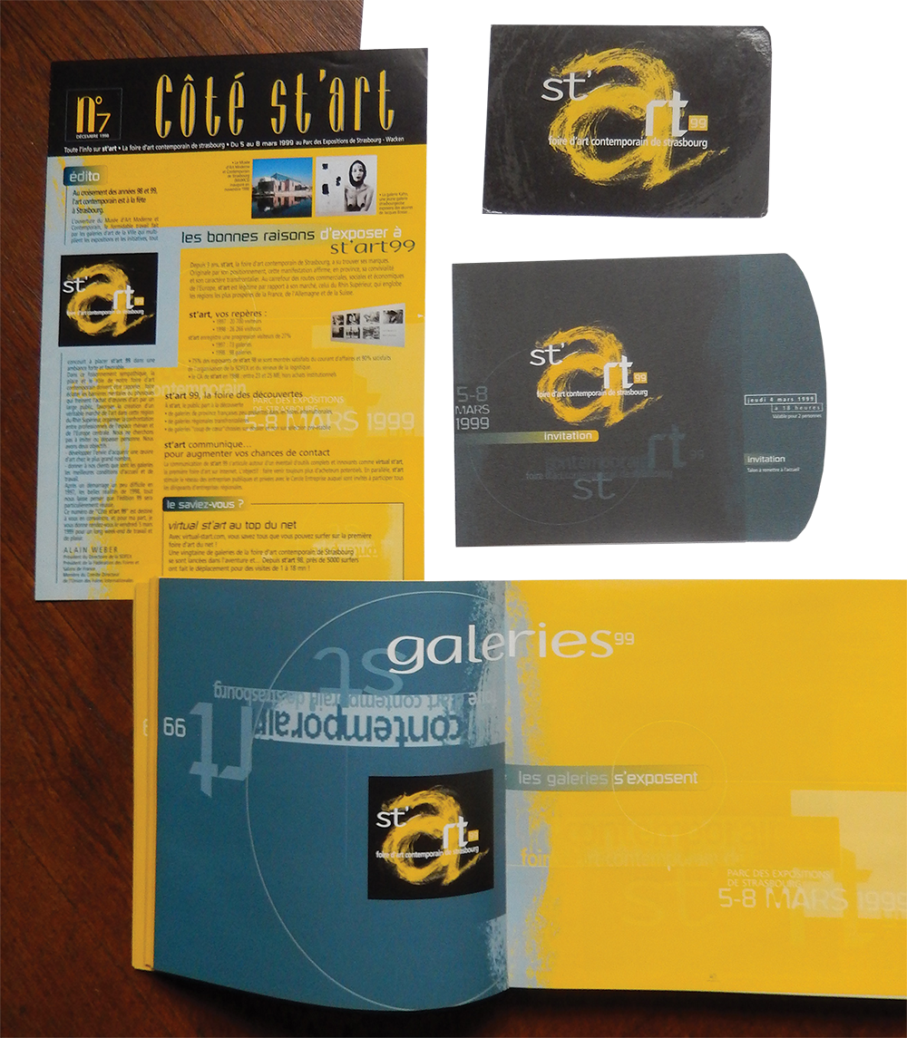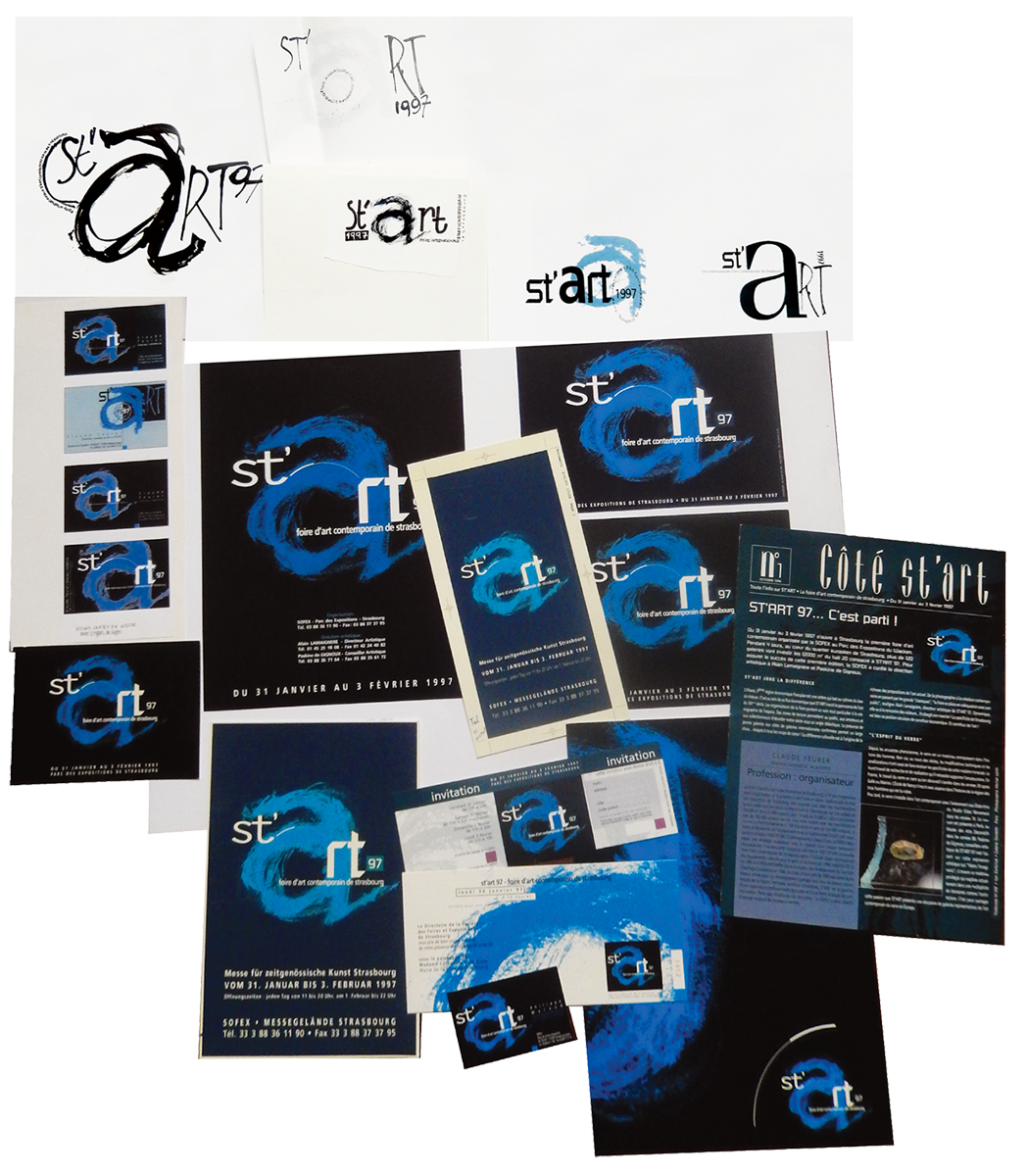 À la manœuvre pour créer ce logo qui débute par mes roughs sur papier pour finir par la réalisation sur ordinateur. Suivront ses multiples déclinaisons : mise en page du catalogue d’exposition de l’année, pochettes/classeurs, cartons d’invitations, signalétique, affiches multiples, en passant par des annonces aux formats divers, sans oublier les tickets d’entrée ou cartes postales… Enfin, tout !