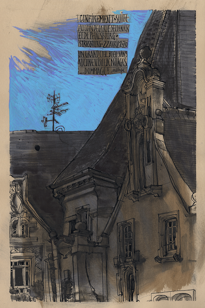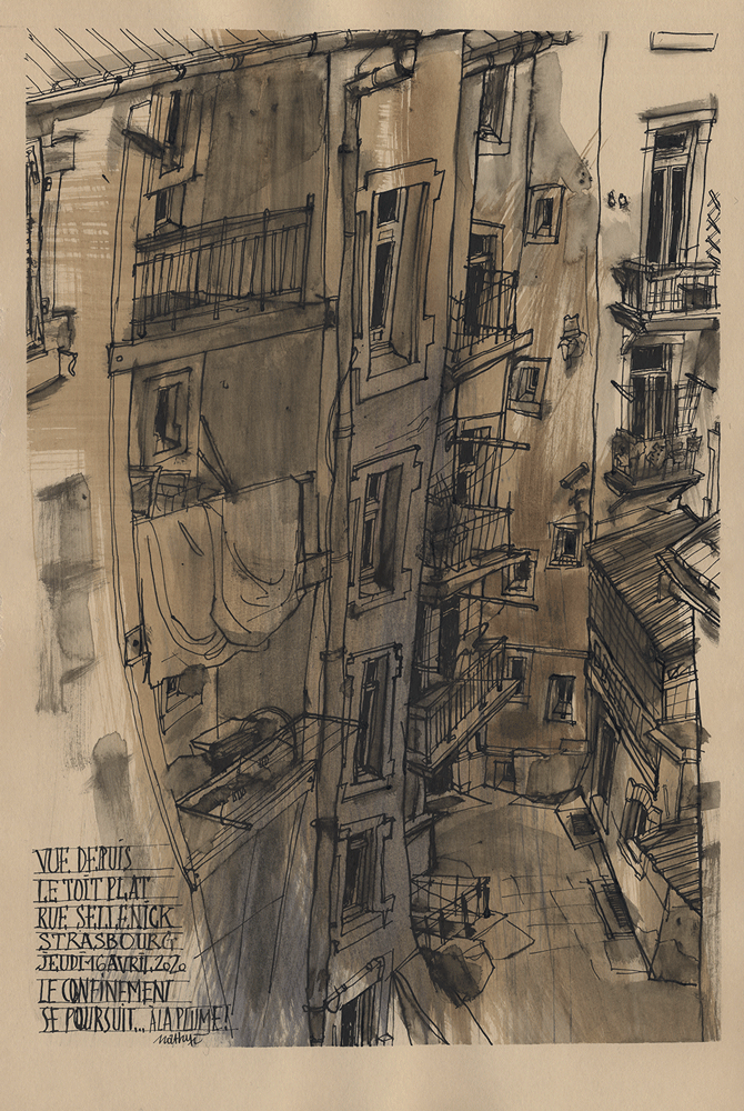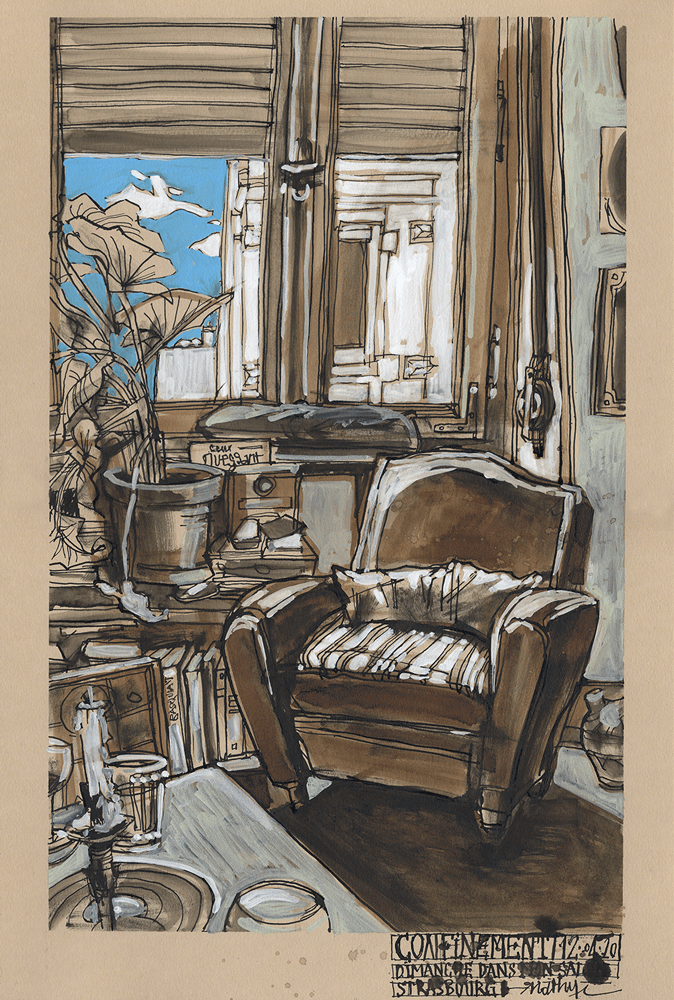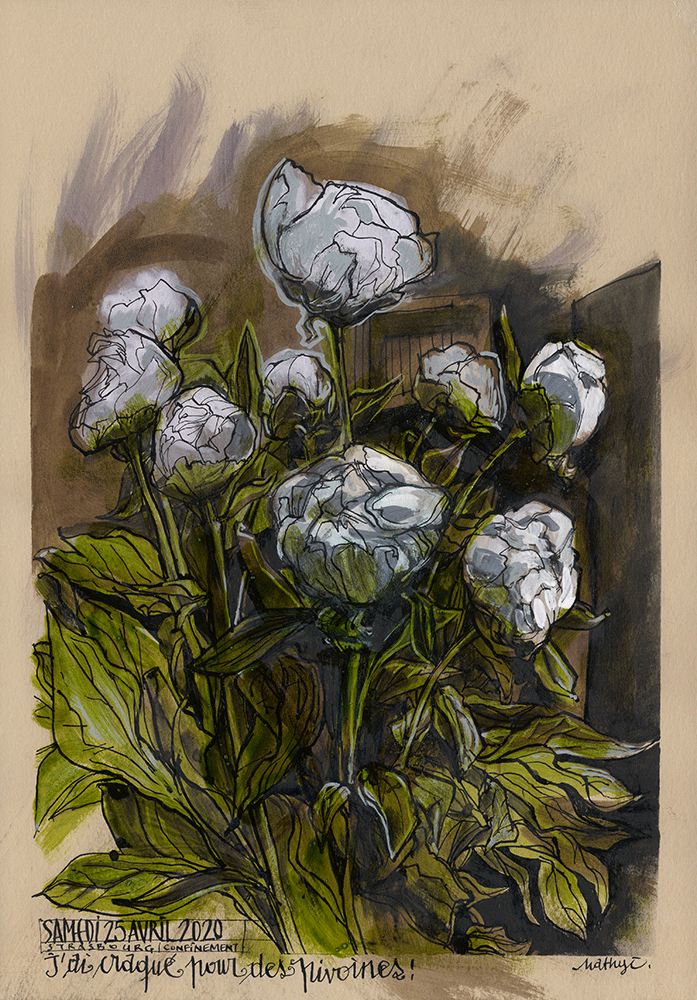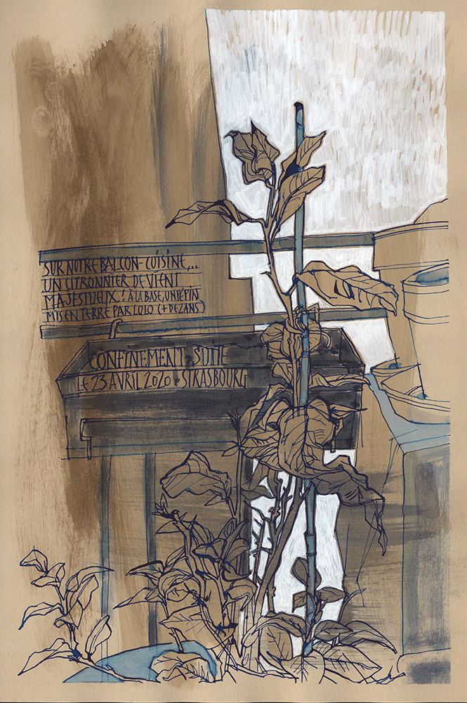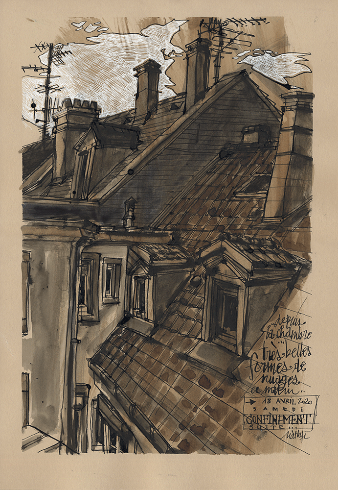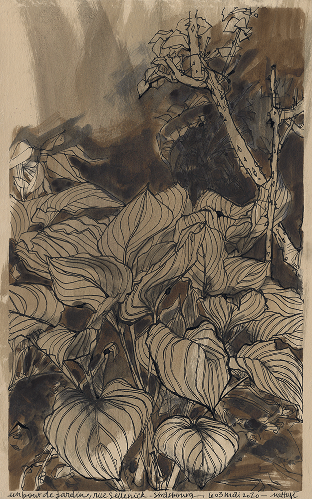 Encre de chine + brou de noix + feutre Sign pen + crayons blanc et gris