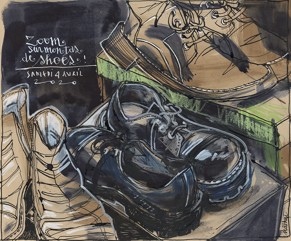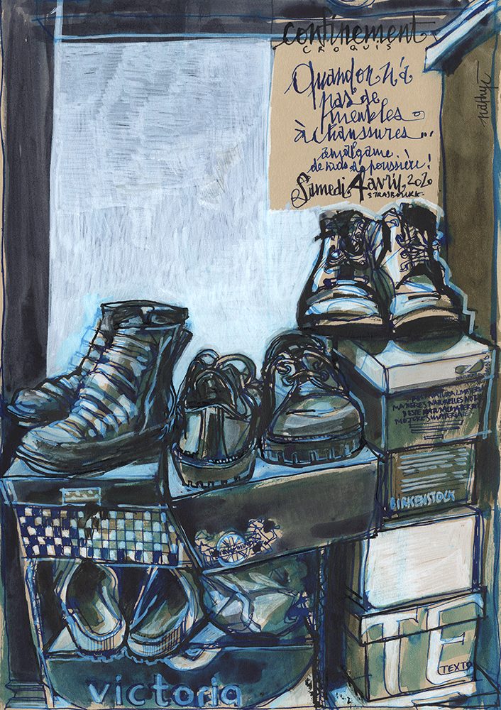 Encre de chine + brou de noix + Liquitex bleu + crayons blanc et bordeaux Faber-Castell
