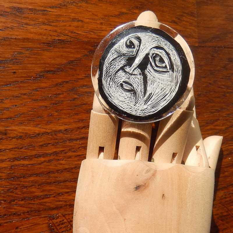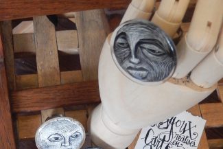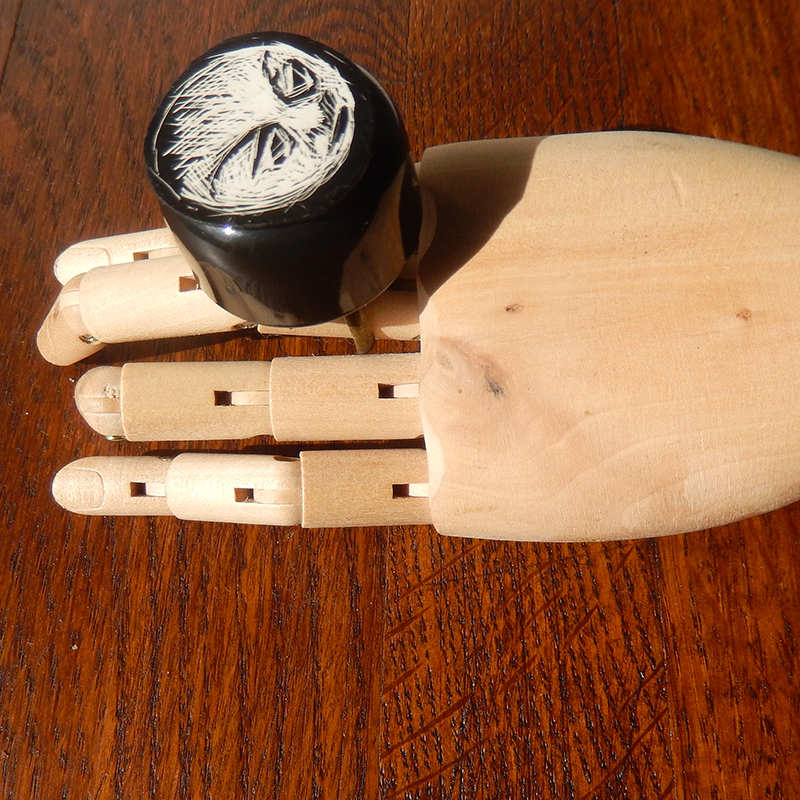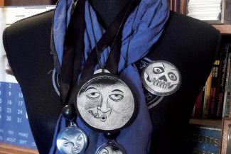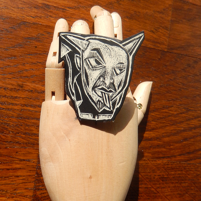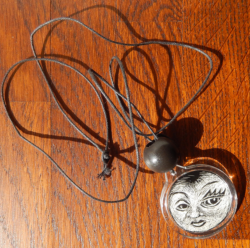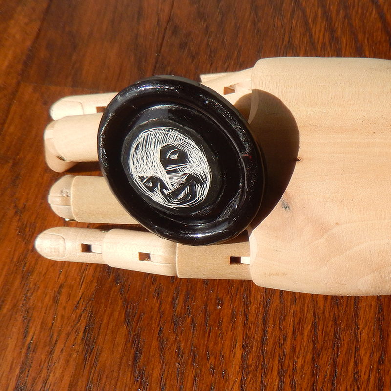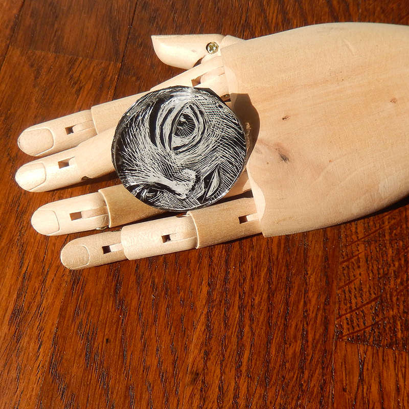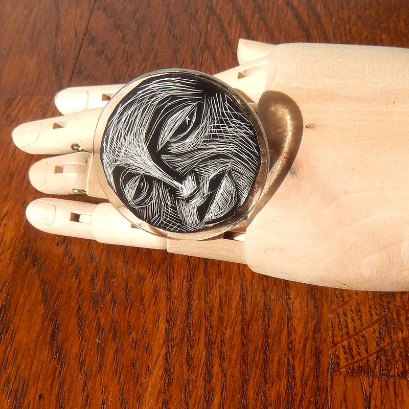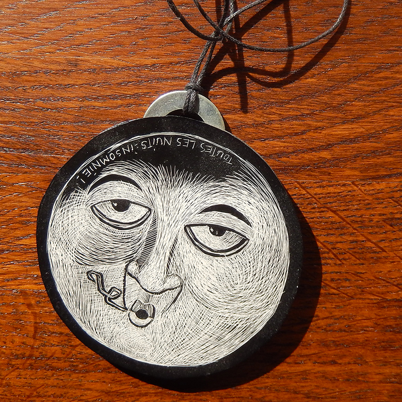 Elle est le sujet de mes bijoux : colliers, bagues ou broches… sans cesse renouvelés, contrecollés et vernis.