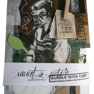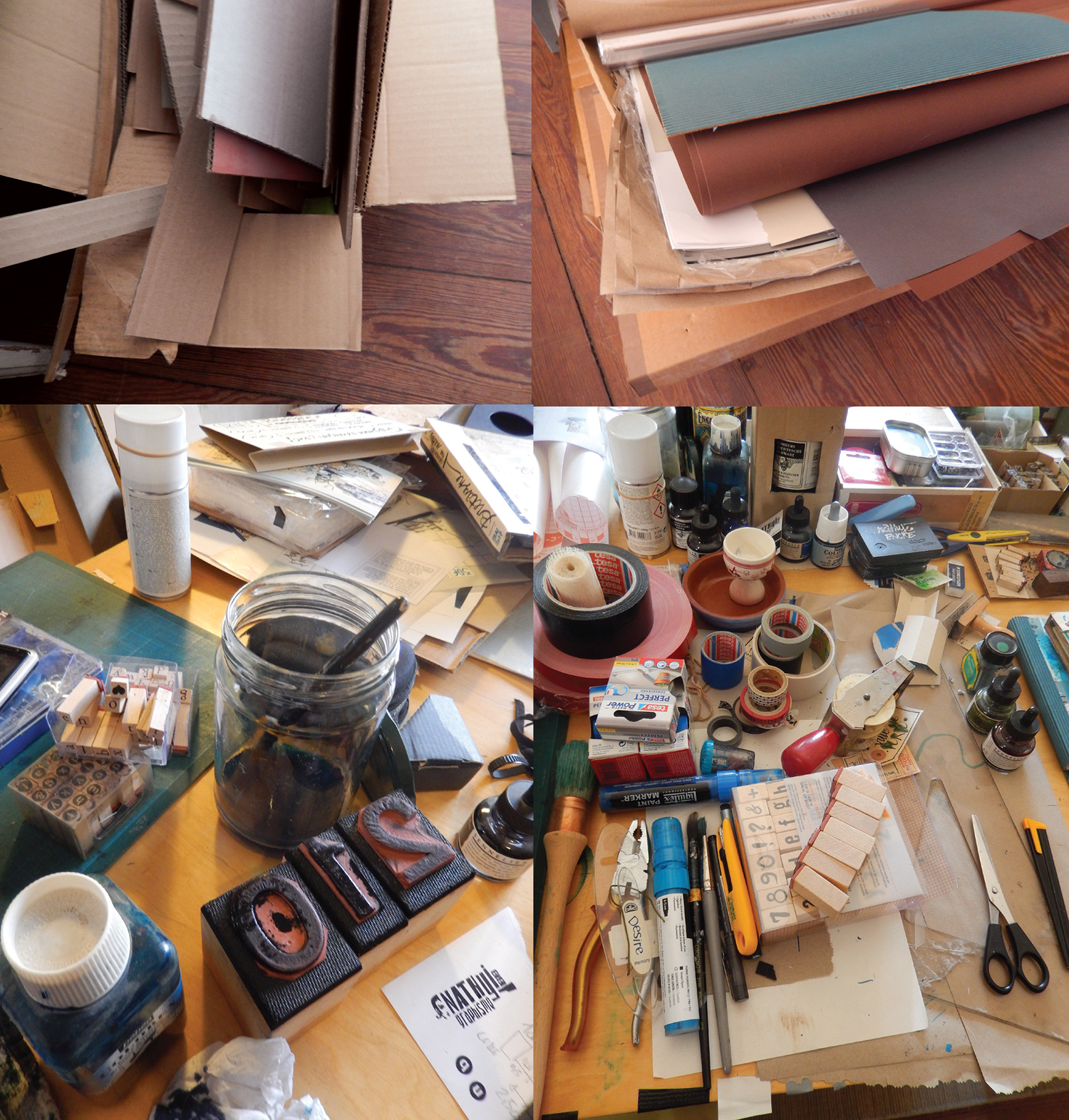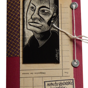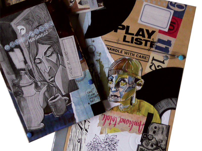 Des carnets de tous formats et types de papiers selon les échantillons récoltés, sans cesse renouvelés. Des reliures différentes pour chaque, style nuancier, accordéon ou livret classique, avec collages, tampons et généralement un petit croquis-dessin original, un bout de linogravure ou une carte à gratter sur la couverture…