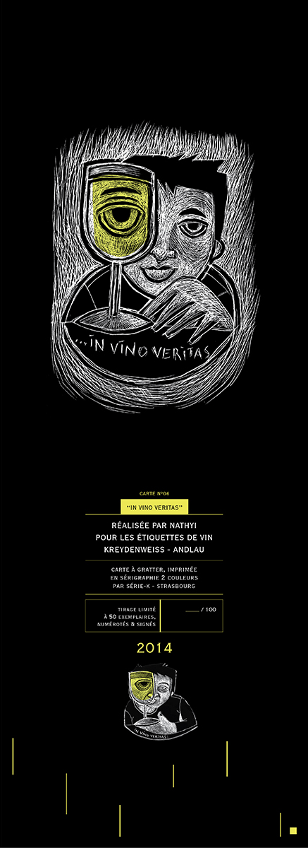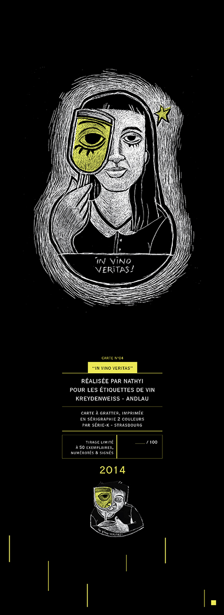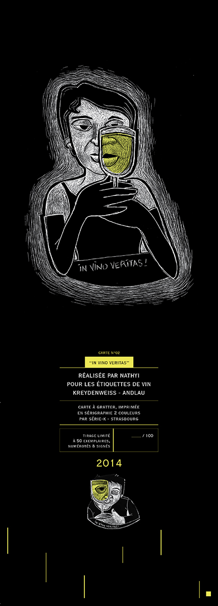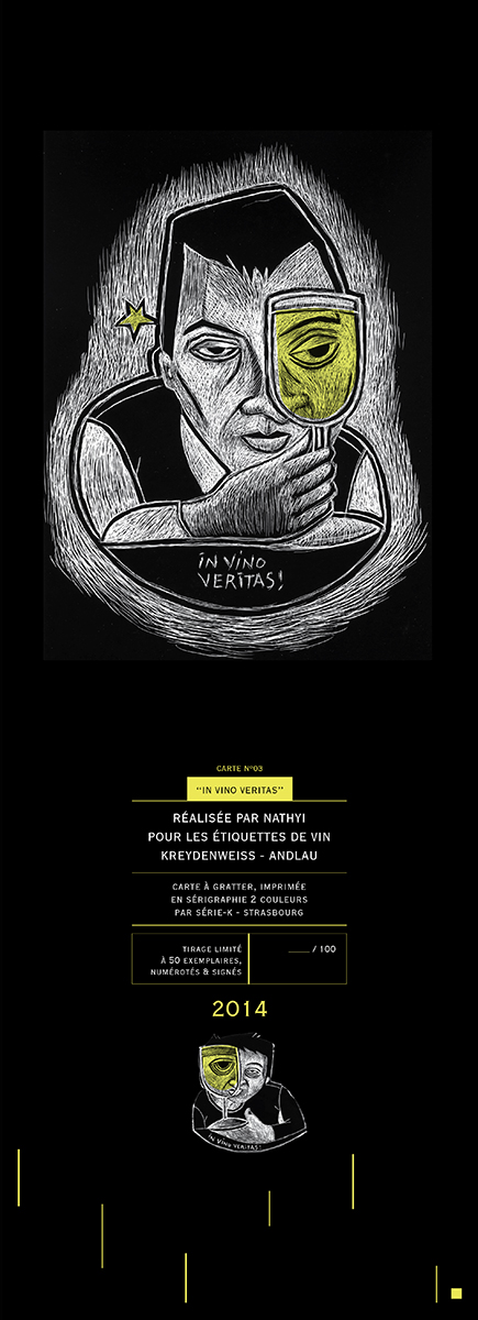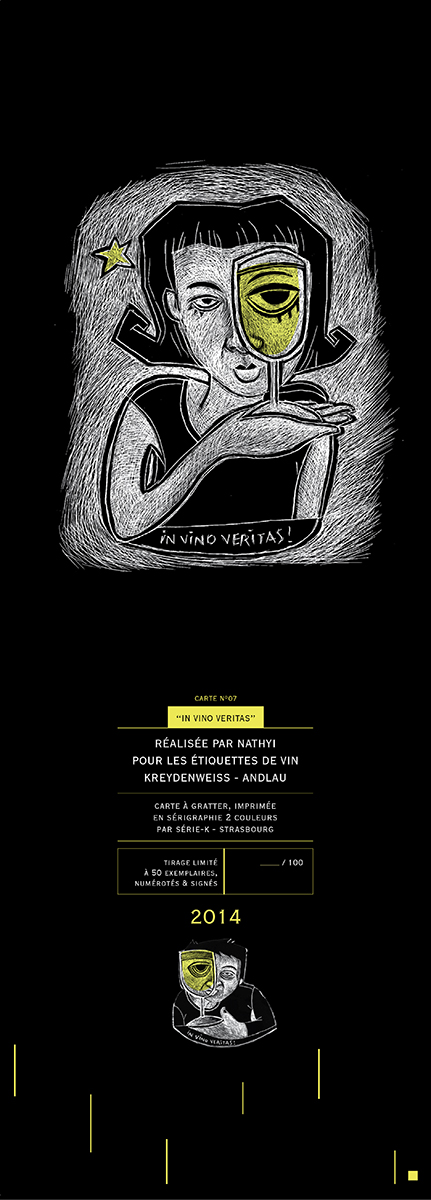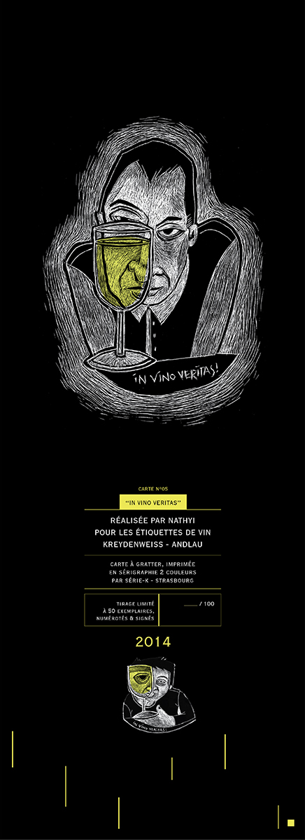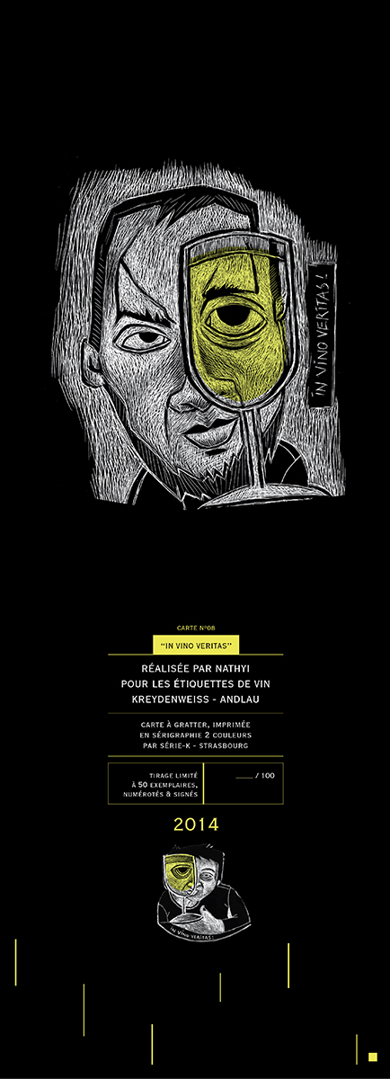 Suite à la demande de la maison Kreydenweiss d’Andlau, j’ai participé à l’élaboration d’une étiquette de vin. Pour se faire, il y a eu plusieurs propositions de personnages, réalisés en carte à gratter, huit en tout. L’image 01 étant celle retenue pour figurer sur les bouteilles, les autres sont devenues des affichettes sérigraphiées.